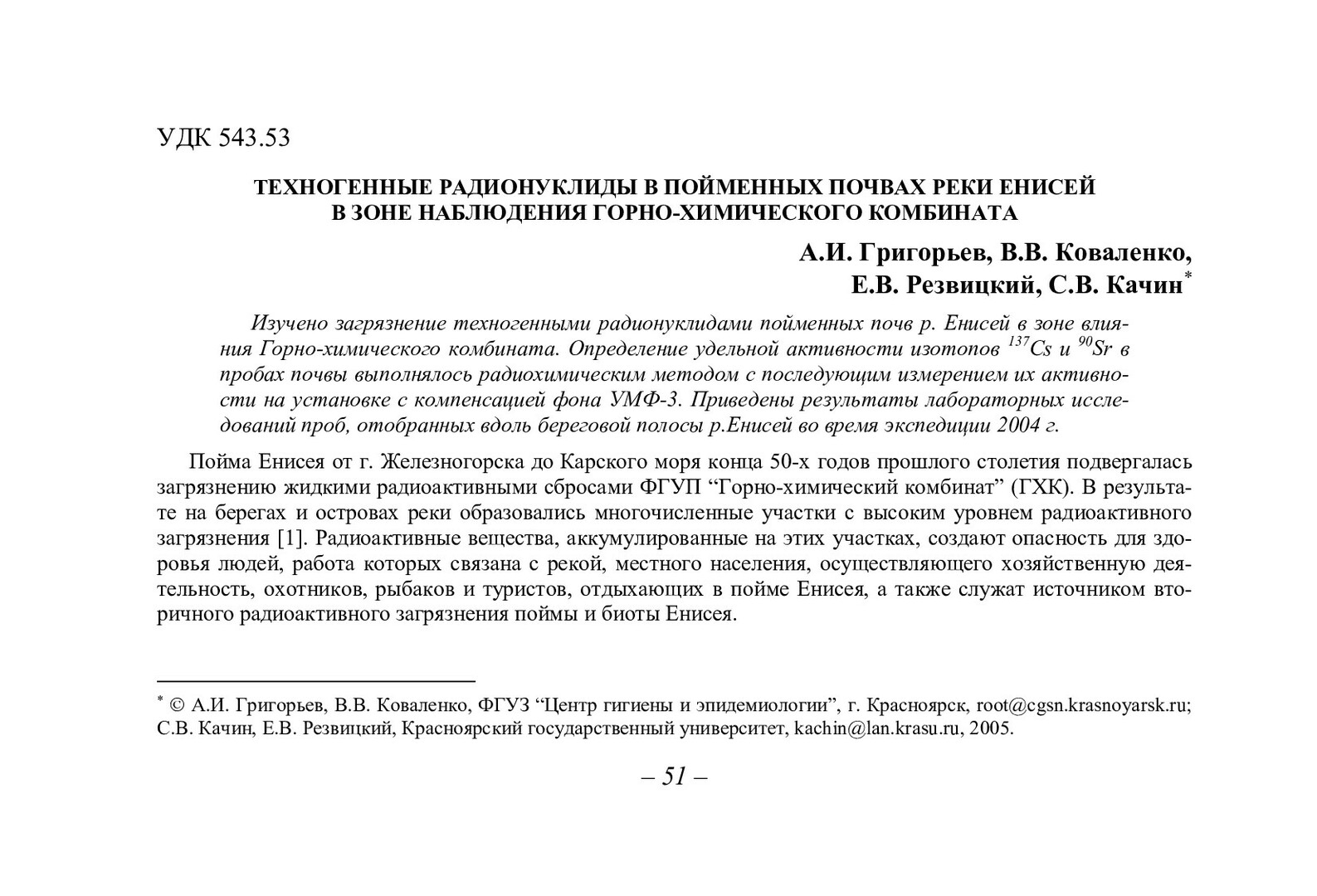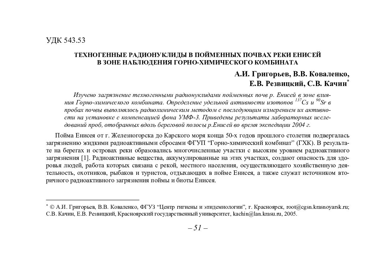 Библиографическое описание:Техногенные радионуклиды в пойменных почвах реки Енисей в зоне наблюдения Горно-химического комбината / А. И. Григорьев, В. В. Коваленко, Е. В. Резвицкий, С. В. Качин. - Текст : непосредственный // Вестник Красноярского государственного университета. - 2005. - Естественные науки, № 2. - С. 51-56. - Библиогр. в конце ст.