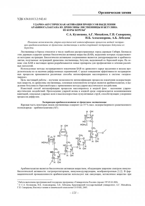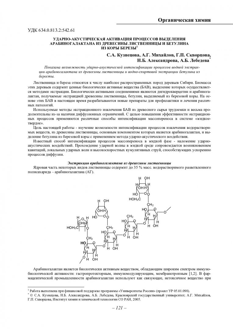 Библиографическое описание:Ударно-акустическая активация процессов выделения арабиногалактана из древесины лиственницы и бетулина из коры березы / С. А. Кузнецова, А. Г. Михайлов, Г. П. Скворцова [и др.]. - Текст : непосредственный // Вестник Красноярского государственного университета. - 2005. - Естественные науки, № 2. - С. 121-124. - Библиогр. в конце ст.
