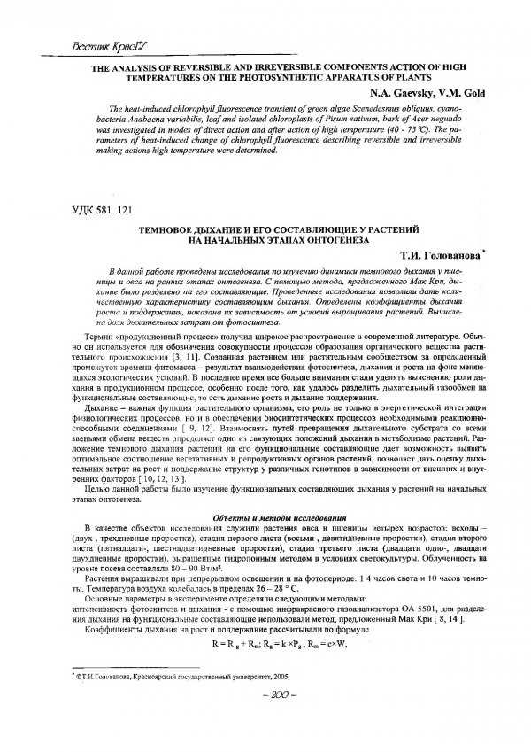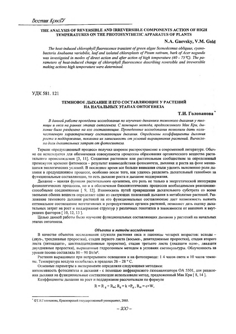 Библиографическое описание:Голованова, Тамара Ивановна. Темновое дыхание и его составляющие у растений на начальных этапах онтогенеза / Т. И. Голованова. - Текст : электронный // Вестник Красноярского государственного университета. - 2005. - Естественные науки, № 5. - С. 200-205. - Библиогр. в конце ст.