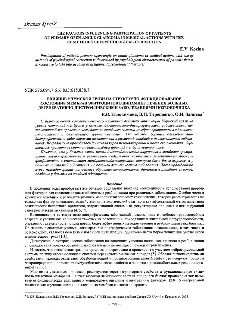 Влияние Учумской грязи на структурно-функциональное состояние мембран эритроцитов в динамике лечения больных дегенеративно-дистрофическими заболеваниями позвоночника