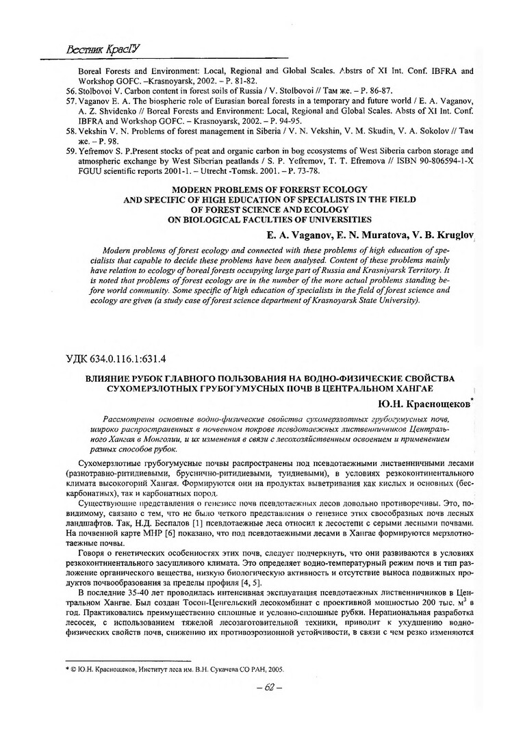 Библиографическое описание:Краснощеков, Юрий Николаевич. Влияние рубок главного пользования на водно-физические свойства сухомерзлотных грубогумусных почв в Центральном Хангае / Ю. Н. Краснощеков. - Текст : электронный // Вестник Красноярского государственного университета. - 2005. - Естественные науки, № 5. - С. 62-67. - Библиогр. в конце ст.
