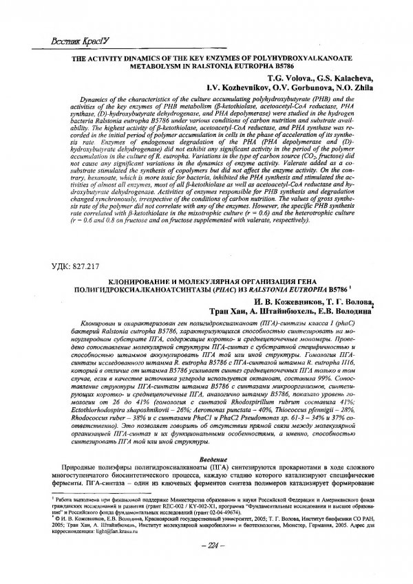Библиографическое описание:Кожевников, Игорь Валерьевич. Клонирование и молекулярная организация гена полигидроксиалканоатсинтазы (phaC) из Ralstonia Eutropha B5786 / И. В. Кожевников, Т. Г. Волова, Хаи Тран, А. Штайнбюхель, Е. В. Володина. - Текст : электронный // Вестник Красноярского государственного университета. - 2005. - Естественные науки, № 5. - С. 224-232. - Библиогр. в конце ст.