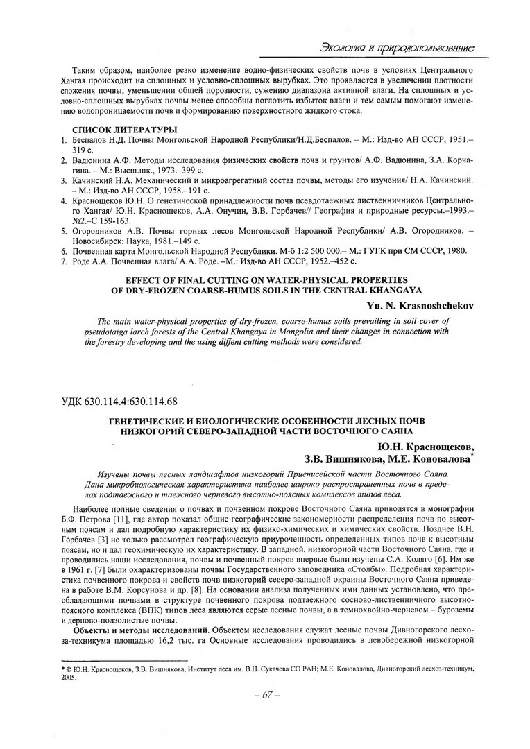 Библиографическое описание:Краснощеков, Юрий Николаевич. Генетические и биологические особенности лесных почв низкогорий северо-западной части Восточного Саяна / Ю. Н. Краснощеков, З. В. Вишнякова, М. Е. Коновалова. - Текст : электронный // Вестник Красноярского государственного университета. - 2005. - Естественные науки, № 5. - С. 67-74. - Библиогр. в конце ст.