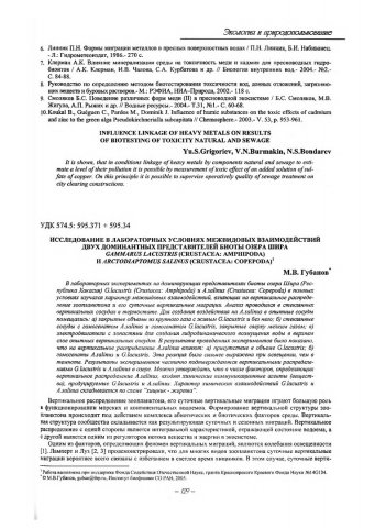 Исследование в лабораторных условиях межвидовых взаимодействий двух доминантных представителей биоты озера Шира Gammarus Lacustris (Crustacea: Amphipoda) и Arctodiaptomus Salinus (Crustacea: Copepoda)