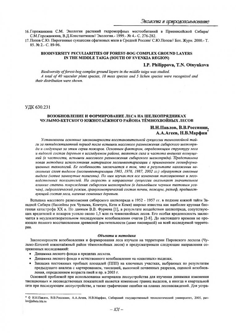 Библиографическое описание:Павлов, И. Н. Возобновление и формирование леса на шелкопрядниках Чулымо-Кетского южнотаежного района темнохвойных лесов / И. Н. Павлов, В. В. Россинин, А. А. Агеев, Н. В. Марфин. - Текст : электронный // Вестник Красноярского государственного университета. - 2005. - Естественные науки, № 5. - С. 101-108. - Библиогр. в конце ст.
