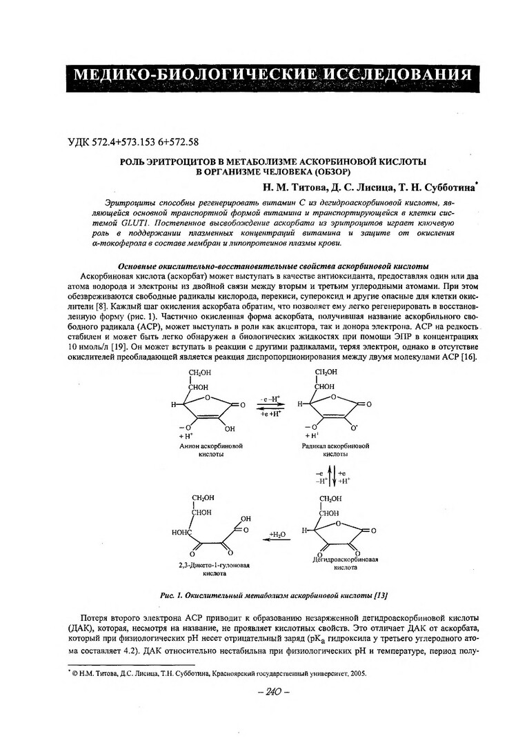 Библиографическое описание:Титова, Надежда Митрофановна. Роль эритроцитов в метаболизме аскорбиновой кислоты в организме человека (обзор) / Н. М. Титова, Д. С. Лисица, Т. Н. Субботина. - Текст : электронный // Вестник Красноярского государственного университета. - 2005. - Естественные науки, № 5. - С. 240-246. - Библиогр. в конце ст.