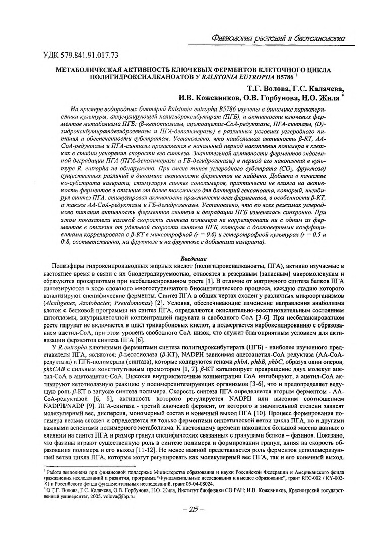 Библиографическое описание:Волова, Татьяна Григорьевна. Метаболическая активность ключевых ферментов клеточного цикла полигидроксиалканоатов у Ralstonia Eutropha B5786 / Т. Г. Волова, Г. С. Калачева, И. В. Кожевников, О. В. Горбунова, Наталья Олеговна Жила. - Текст : электронный // Вестник Красноярского государственного университета. - 2005. - Естественные науки, № 5. - С. 215-224. - Библиогр. в конце ст.