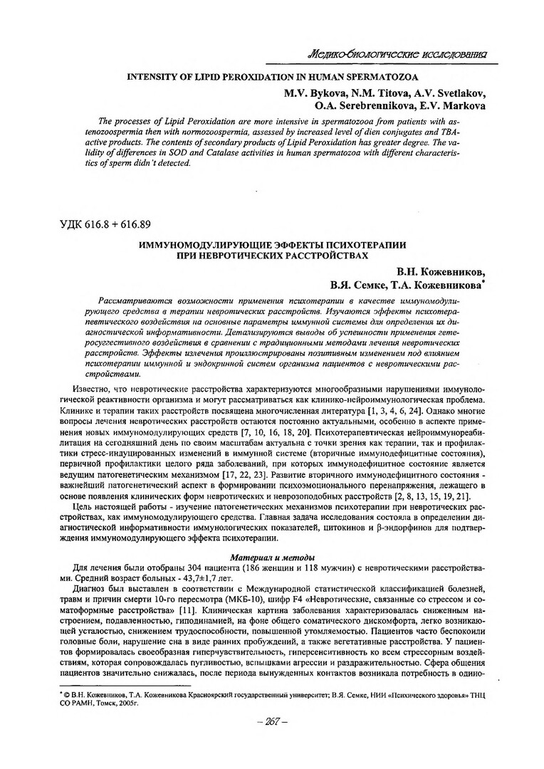 Библиографическое описание:Кожевников, Вадим Николаевич. Иммуномодулирующие эффекты психотерапии при невротических расстройствах / В. Н. Кожевников, В. Я. Семке, Т. А. Кожевникова. - Текст : электронный // Вестник Красноярского государственного университета. - 2005. - Естественные науки, № 5. - С. 267-271. - Библиогр. в конце ст.