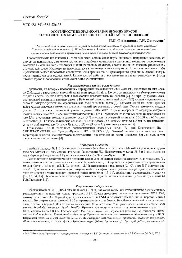 Библиографическое описание:Филиппова, Ирина Панфиловна. Особенности биоразнообразия нижних ярусов лесоболотных комплексов зоны средней тайги (юг Эвенкии) / И. П. Филиппова, Т. Н. Отнюкова. - Текст : электронный // Вестник Красноярского государственного университета. - 2005. - Естественные науки, № 5. - С. 96-101. - Библиогр. в конце ст.