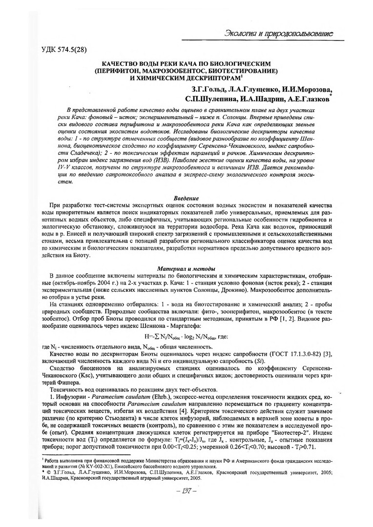 Библиографическое описание:Гольд, Зоя Георгиевна. Качество воды реки Кача по биологическим (перифитон, макрозообентос, биотестирование) и химическим дескрипторам / З. Г. Гольд, Л. А. Глущенко, И. И. МорозоваСветлана Петровна Шулепина [и др.]. - Текст : электронный // Вестник Красноярского государственного университета. - 2005. - Естественные науки, № 5. - С. 137-146. - Библиогр. в конце ст.