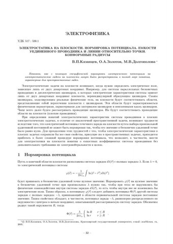 Библиографическое описание:Казанцев, Владимир Петрович. Электростатика на плоскости. Нормировка потенциала. Емкости уединенного проводника и линии относительно точки. Конформные радиусы / В. П. Казанцев, О. А. Золотов, М. В. Долгополова. - Текст : непосредственный // Вестник Красноярского государственного университета. - 2005. - Физико-математические науки, № 1. - С. 32-38. - Библиогр. в конце ст.