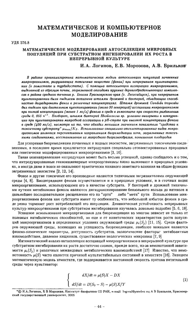 Библиографическое описание:Логинов, Иван Александрович. Математическое моделирование автоселекции микробных популяций при субстратном ингибировании их роста в непрерывной культуре / И. А. Логинов, Е. В. Морозова, А. В. Брильков. - Текст : непосредственный // Вестник Красноярского государственного университета. - 2005. - Физико-математические науки, № 1. - С. 44-49. - Библиогр. в конце ст.