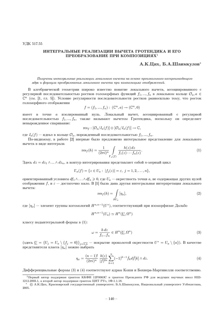 Библиографическое описание:Цих, Август Карлович. Интегральные реализации вычета Гротендика и его преобразование при композициях / А. К. Цих, Б. А. Шаимкулов. - Текст : непосредственный // Вестник Красноярского государственного университета. - 2005. - Физико-математические науки, № 1. - С. 140-144. - Библиогр. в конце ст.