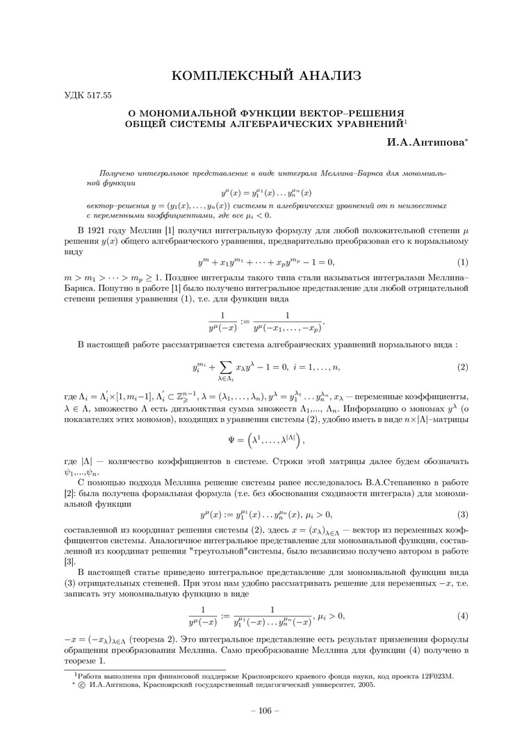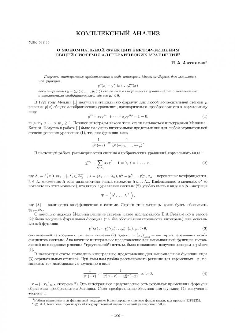 Библиографическое описание:Антипова, Ирина Августовна. О мономиальной функции вектор-решения общей системы алгебраических уравнений / И. А. Антипова. - Текст : непосредственный // Вестник Красноярского государственного университета. - 2005. - Физико-математические науки, № 1. - С. 106-110. - Библиогр. в конце ст.