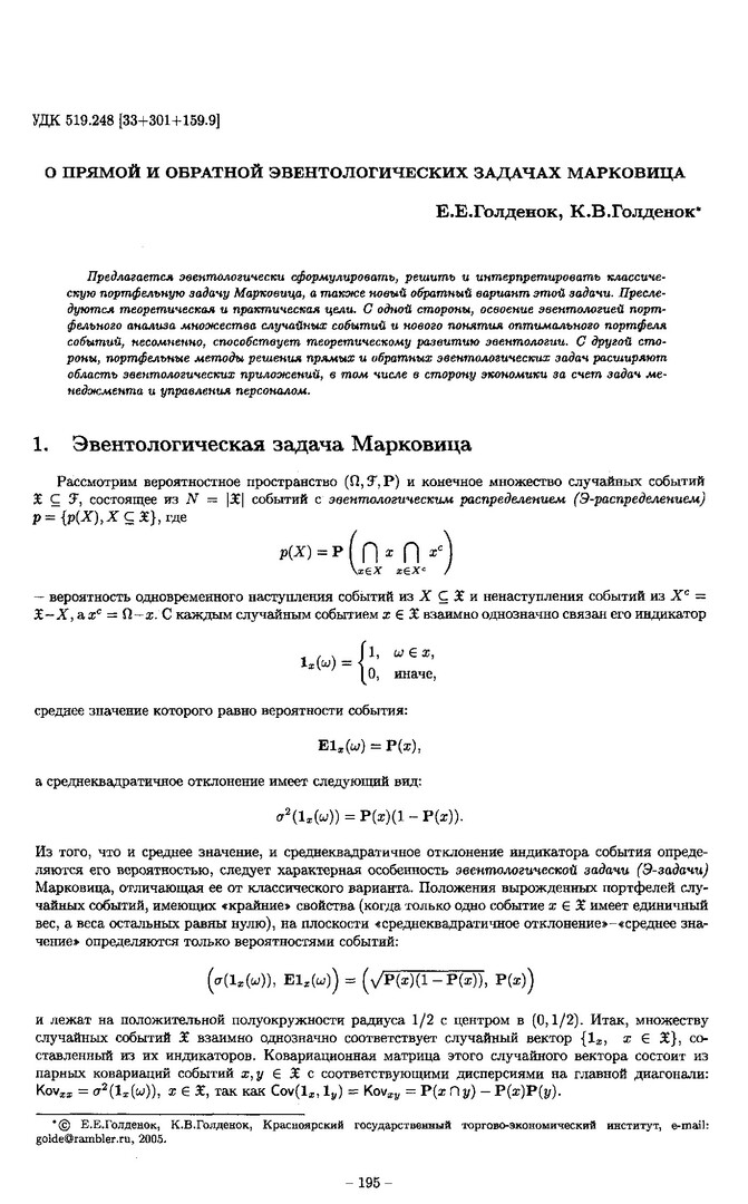 Библиографическое описание:Голденок, Елена Евгеньевна. О прямой и обратной эвентологических задачах Марковица / Е. Е. Голденок, К. В. Голденок. - Текст : непосредственный // Вестник Красноярского государственного университета. - 2005. - Физико-математические науки, № 1. - С. 195-203. - Библиогр. в конце ст.