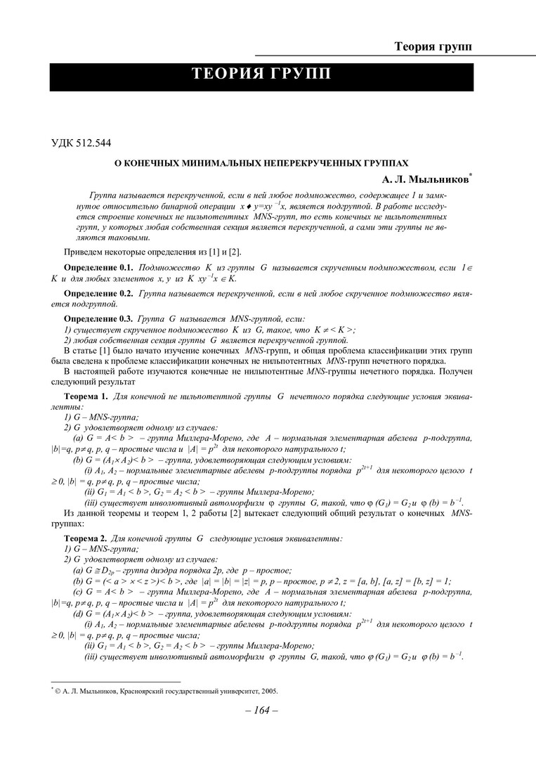 Библиографическое описание:Мыльников, Андрей Леонидович. О конечных минимальных неперекрученных группах / А. Л. Мыльников. - Текст : непосредственный // Вестник Красноярского государственного университета. - 2005. - Физико-математические науки, № 4. - С. 164-169. - Библиогр. в конце ст.