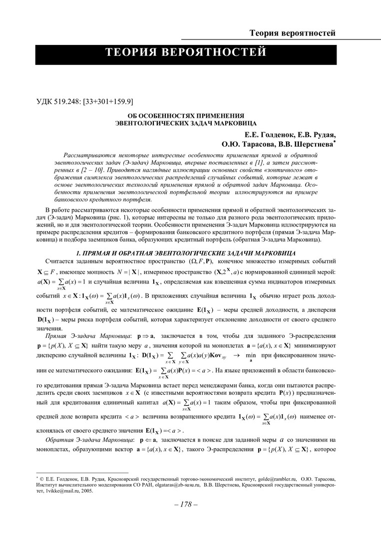 Библиографическое описание:Об особенностях применения эвентологических задач Марковица / Е. Е. Голденок, Е. В. Рудая, О. Ю. Тарасова, В. В. Шерстнева. - Текст : непосредственный // Вестник Красноярского государственного университета. - 2005. - Физико-математические науки, № 4. - С. 178-183. - Библиогр. в конце ст.