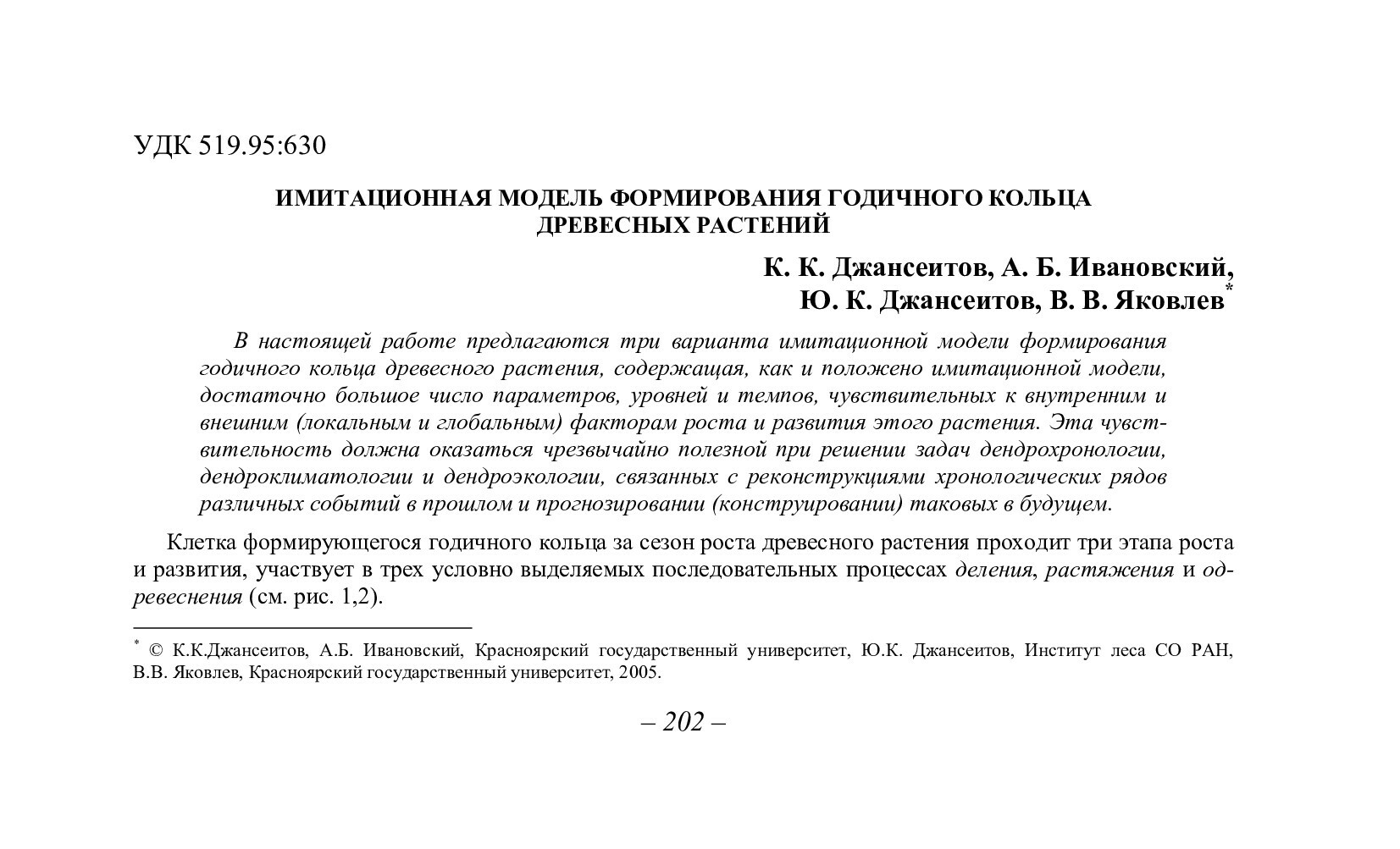 Библиографическое описание:Имитационная модель формирования годичного кольца древесных растений / К. К. Джансеитов, А. Б. Ивановский, Ю. К. Джансеитов, В. В. Яковлев. - Текст : непосредственный // Вестник Красноярского государственного университета. - 2005. - Физико-математические науки, № 4. - С. 202-210. - Библиогр. в конце ст.