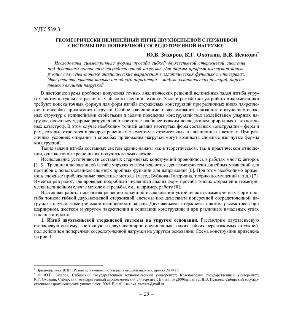 Библиографическое описание:Захаров, Юрий Владимирович. Геометрически нелинейный изгиб двухзвеньевой стержневой системы при поперечной сосредоточенной нагрузке / Ю. В. Захаров, К. Г. Охоткин, В. В. Исакова. - Текст : непосредственный // Вестник Красноярского государственного университета. - 2005. - Физико-математические науки, № 4. - С. 25-32. - Библиогр. в конце ст.