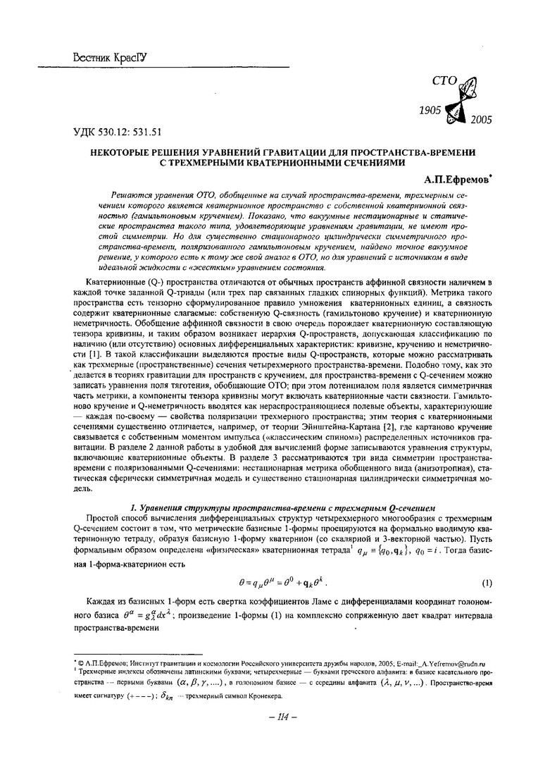Библиографическое описание:Ефремов, А. П. Некоторые решения уравнений гравитации для пространства-времени с трехмерными кватернионными сечениями / А. П. Ефремов. - Текст : электронный // Вестник Красноярского государственного университета. - 2005. - Физико-математические науки, № 7. - С. 114-120. - Библиогр. в конце ст.