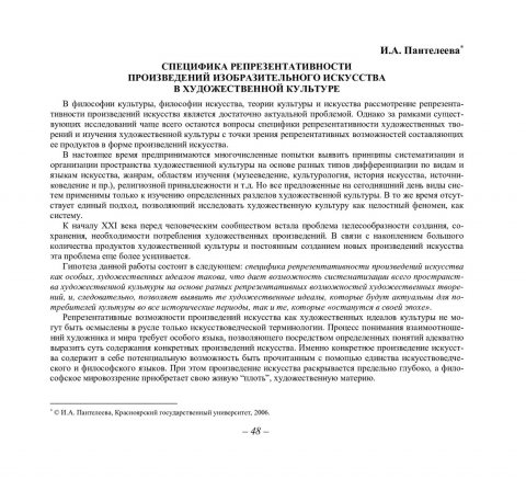 Библиографическое описание:Пантелеева, Ирина Анатольевна. Специфика репрезентативности произведений изобразительного искусства в художественной культуре / И. А. Пантелеева. - Текст : непосредственный // Вестник Красноярского государственного университета. - 2006. - Гуманитарные науки, № 10. - С. 48-61. - Библиогр. в конце ст.