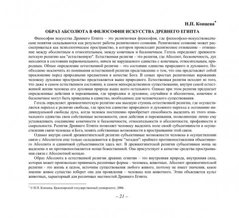 Библиографическое описание:Копцева, Наталья Петровна. Образ Абсолюта в философии искусства Древнего Египта / Н. П. Копцева. - Текст : непосредственный // Вестник Красноярского государственного университета. - 2006. - Гуманитарные науки, № 10. - С. 21-25.