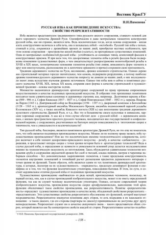 Библиографическое описание:Пименова, Наталья Николаевна. Русская изба как произведение искусства: свойство репрезентативности / Н. Н. Пименова. - Текст : непосредственный // Вестник Красноярского государственного университета. - 2006. - Гуманитарные науки, № 10. - С. 138-144. - Библиогр. в конце ст.