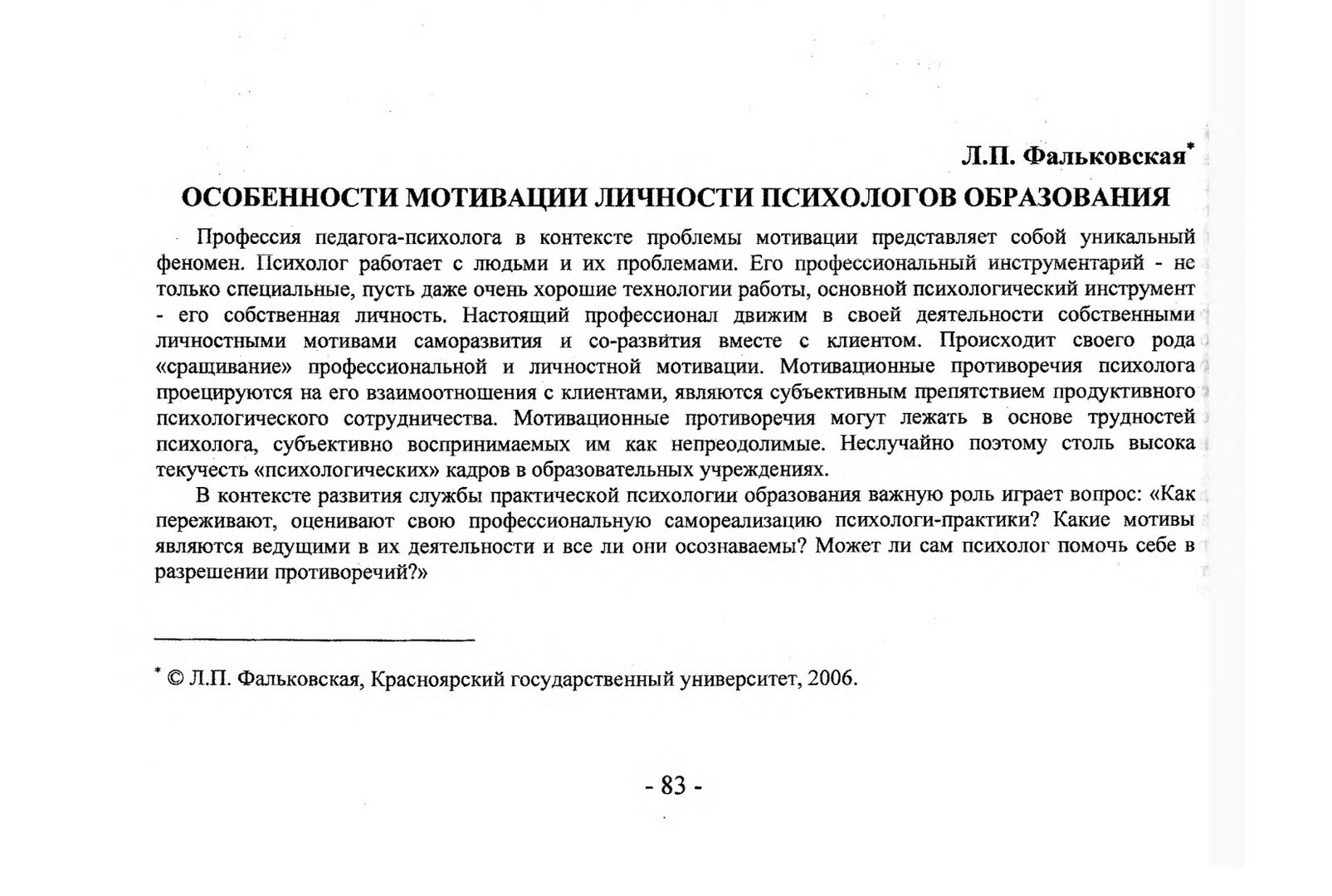Библиографическое описание:Фальковская, Лариса Павловна. Особенности мотивации личности психологов образования / Л. П. Фальковская. - Текст : непосредственный // Вестник Красноярского государственного университета. - 2006. - Гуманитарные науки, № 11. - С. 83-86. - Библиогр. в конце ст.