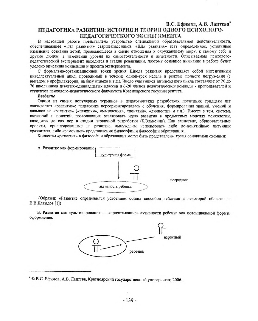 Библиографическое описание:Ефимов, Валерий Сергеевич. Педагогика развития: история и теория одного психолого-педагогического эксперимента / В. С. Ефимов, А. В. Лаптева. - Текст : непосредственный // Вестник Красноярского государственного университета. - 2006. - Гуманитарные науки, № 11. - С. 139-148. - Библиогр. в конце ст.