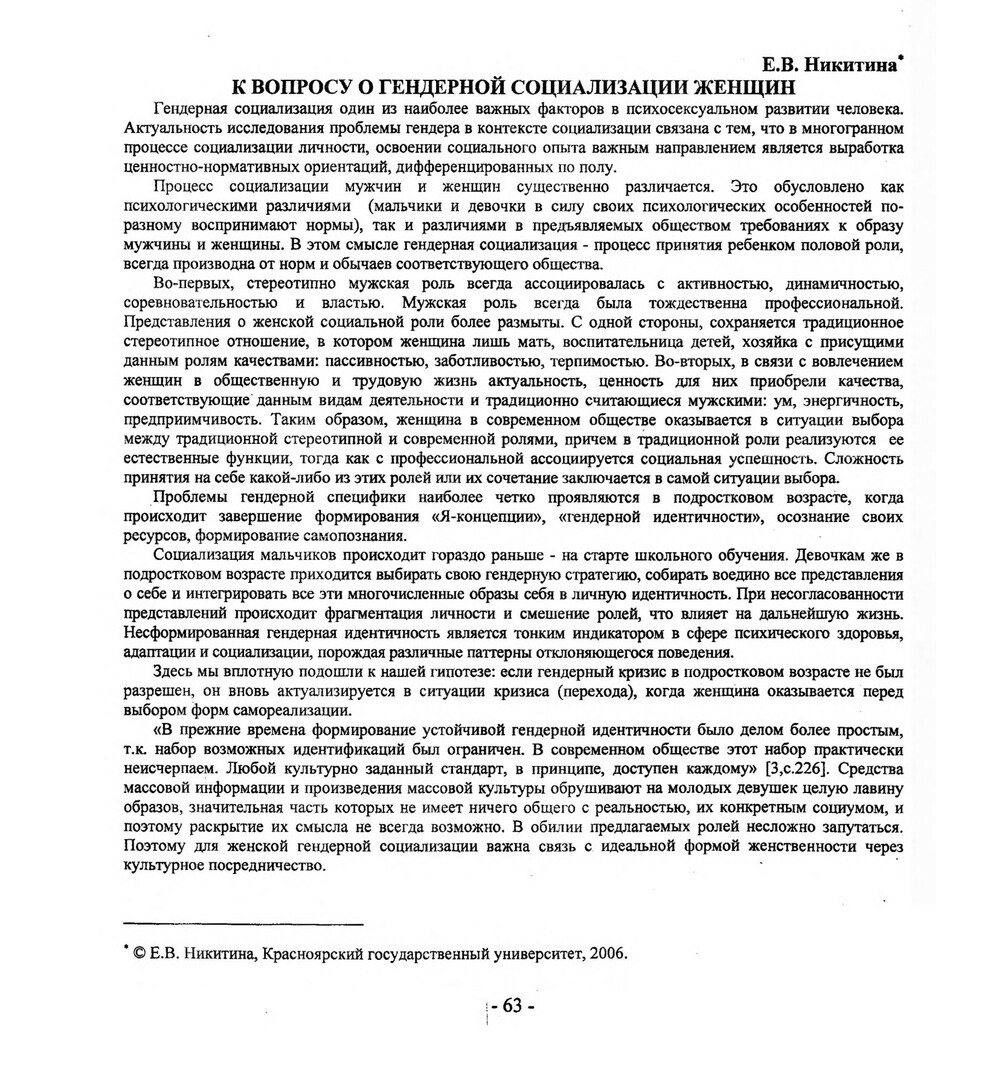 Библиографическое описание:Никитина, Е. В. К вопросу о гендерной социализации женщин / Е. В. Никитина. - Текст : непосредственный // Вестник Красноярского государственного университета. - 2006. - Гуманитарные науки, № 11. - С. 63-67. - Библиогр.: с. 65-66.