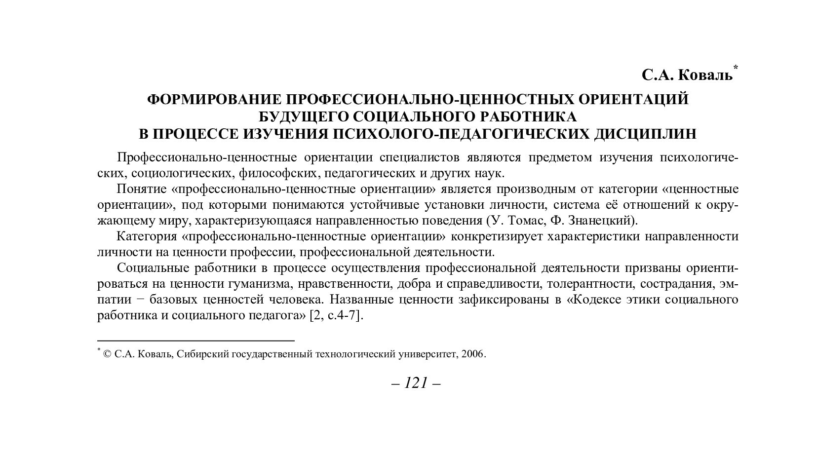 Библиографическое описание:Коваль, С. А. Формирование профессионально-ценностных ориентаций будущего социального работника в процессе изучения психолого-педагогических дисциплин / С. А. Коваль. - Текст : непосредственный // Вестник Красноярского государственного университета. - 2006. - Гуманитарные науки, № 3(1). - С. 121-124. - Библиогр. в конце ст.