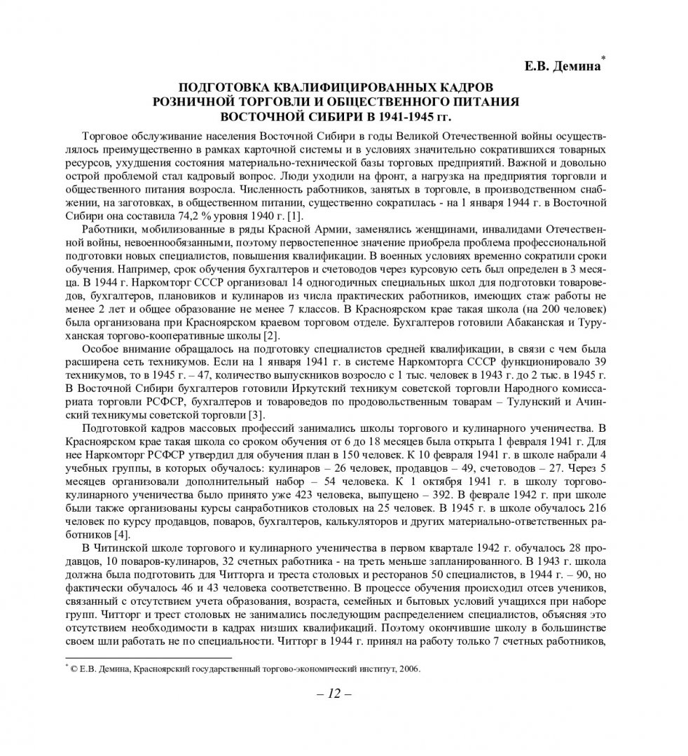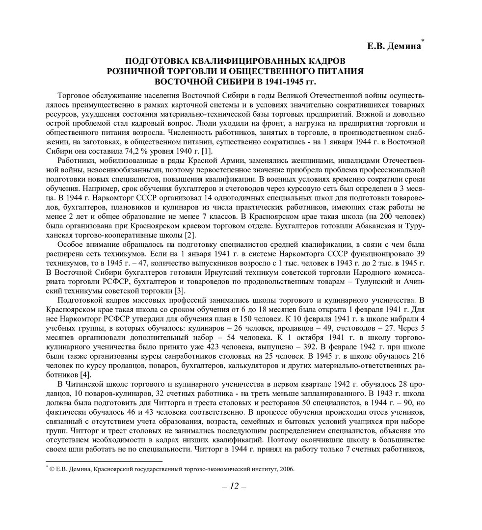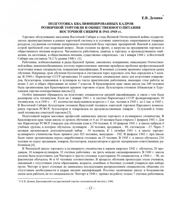Библиографическое описание:Демина, Е. В. Подготовка квалифицированных кадров розничной торговли и общественного питания Восточной Сибири в 1941-1945 гг. / Е. В. Демина. - Текст : непосредственный // Вестник Красноярского государственного университета. - 2006. - Гуманитарные науки, № 3(1). - С. 12-13. - Библиогр. в конце ст.
