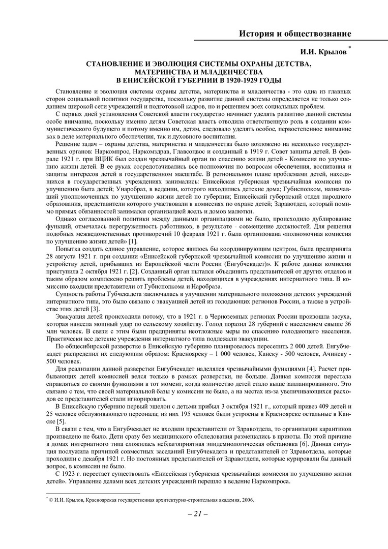 Библиографическое описание:Крылов, И. И. Становление и эволюция системы охраны детства, материнства и младенчества в Енисейской губернии в 1920-1929 годы / И. И. Крылов. - Текст : непосредственный // Вестник Красноярского государственного университета. - 2006. - Гуманитарные науки, № 3(1). - С. 21-24. - Библиогр. в конце ст.