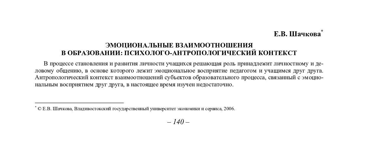 Библиографическое описание:Шачкова, Е. В. Эмоциональные взаимоотношения в образовании: психолого-антропологический контекс / Е. В. Шачкова. - Текст : непосредственный // Вестник Красноярского государственного университета. - 2006. - Гуманитарные науки, № 3(1). - С. 140-142. - Библиогр. в конце ст.