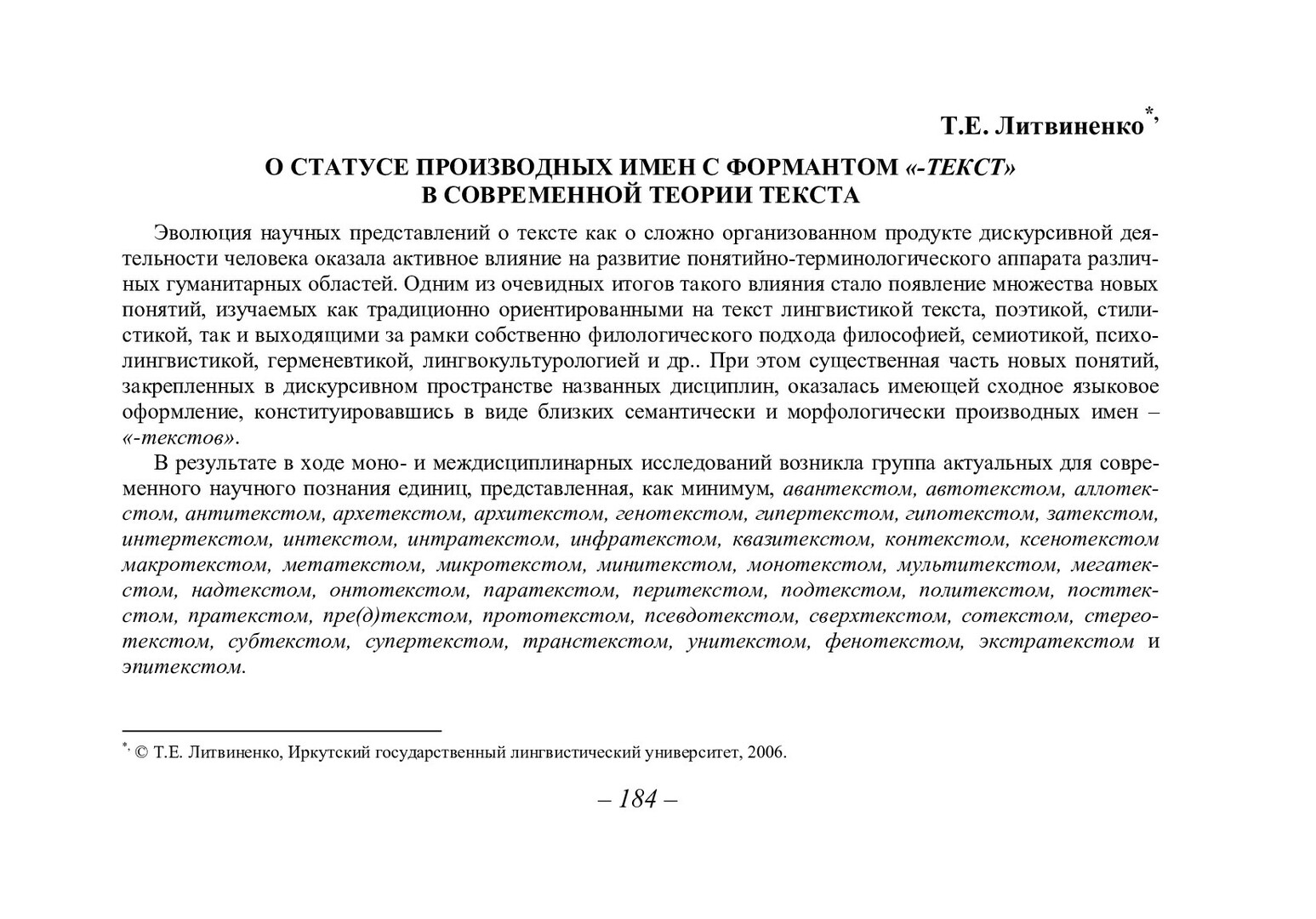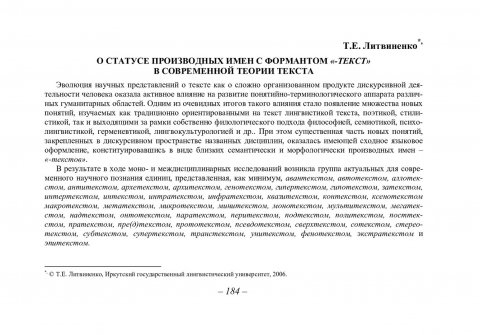 Библиографическое описание:Литвиненко, Т. Е. О статусе производных имен с формантом "-текст" в современной теории текста / Т. Е. Литвиненко. - Текст : непосредственный // Вестник Красноярского государственного университета. - 2006. - Гуманитарные науки, № 3(1). - С. 184-188. - Библиогр. в конце ст.