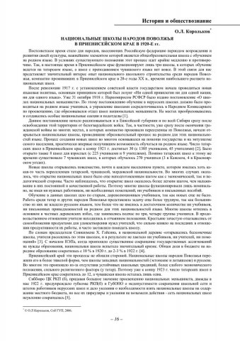 Библиографическое описание:Корольков, О. Л. Национальные школы Народов Поволжья в Приенисейском крае в 1920-е гг. / О. Л. Корольков. - Текст : непосредственный // Вестник Красноярского государственного университета. - 2006. - Гуманитарные науки, № 3(1). - С. 16-19. - Библиогр. в конце ст.