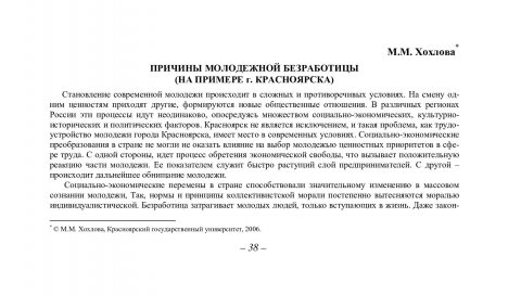 Библиографическое описание:Хохлова, Мария Михайловна. Причины молодежной безработицы : (на примере г. Красноярска) / М. М. Хохлова. - Текст : непосредственный // Вестник Красноярского государственного университета. - 2006. - Гуманитарные науки, № 3(2). - С. 38-43. - Библиогр. в конце ст.