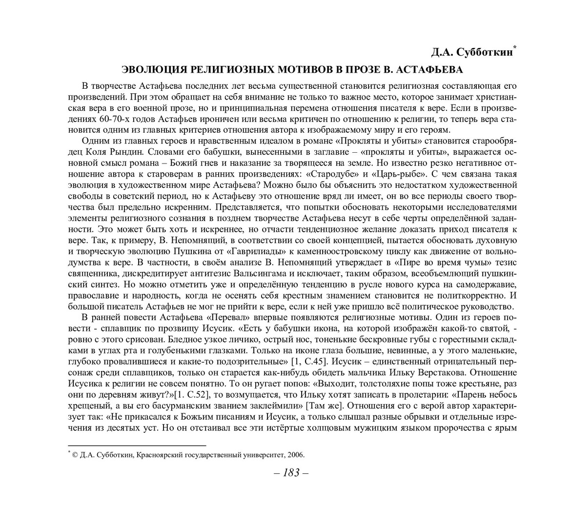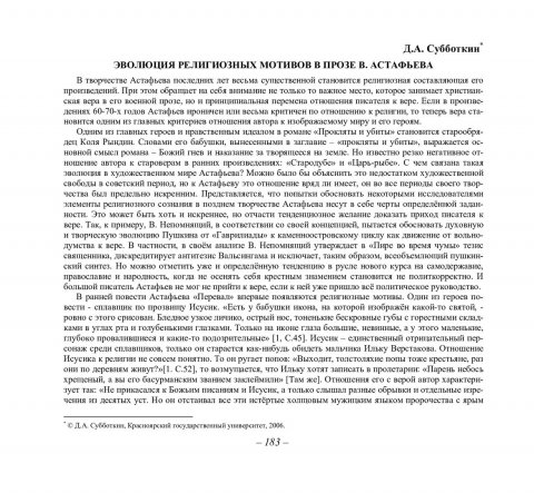 Библиографическое описание:Субботкин, Дмитрий Александрович. Эволюция религиозных мотивов в прозе В. Астафьева / Д. А. Субботкин. - Текст : непосредственный // Вестник Красноярского государственного университета. - 2006. - Гуманитарные науки, № 3(2). - С. 183-187. - Библиогр. в конце ст.