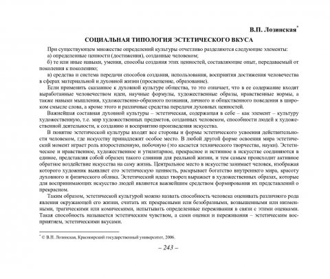 Библиографическое описание:Лозинская, Вера Петровна. Социальная типология эстетического вкуса / В. П. Лозинская. - Текст : непосредственный // Вестник Красноярского государственного университета. - 2006. - Гуманитарные науки, № 3(2). - С. 243-249. - Библиогр. в конце ст.