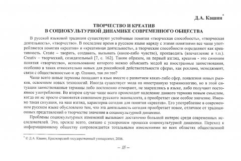 Библиографическое описание:Кашин, Д. А. Творчество и креатив в социокультурной динамике современного общества / Д. А. Кашин. - Текст : непосредственный // Вестник Красноярского государственного университета. - 2006. - Гуманитарные науки, № 6(1). - С. 18-22. - Библиогр. в конце ст.
