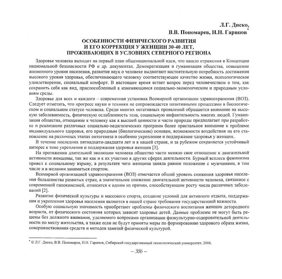 Библиографическое описание:Диско, Л. Г. Особенности физического развития и его коррекция у женщин 30-40 лет, проживающих в условиях Северного региона / Л. Г. Диско, В. В. Пономарев, Н. Н. Гарипов. - Текст : непосредственный // Вестник Красноярского государственного университета. - 2006. - Гуманитарные науки, № 6(1). - С. 386-389. - Библиогр. в конце ст.