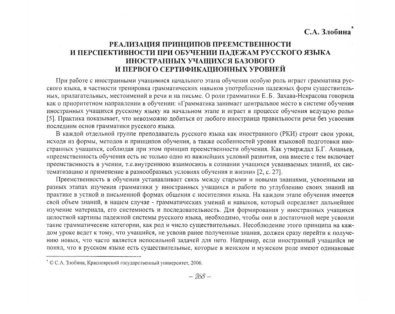 Библиографическое описание:Злобина, Светлана Алексеевна. Реализация принципов преемственности и перспективности при обучении падежам русского языка иностранных учащихся базового и первого сертификационных уровней / С. А. Злобина. - Текст : непосредственный // Вестник Красноярского государственного университета. - 2006. - Гуманитарные науки, № 6(1). - С. 268-270. - Библиогр. в конце ст.