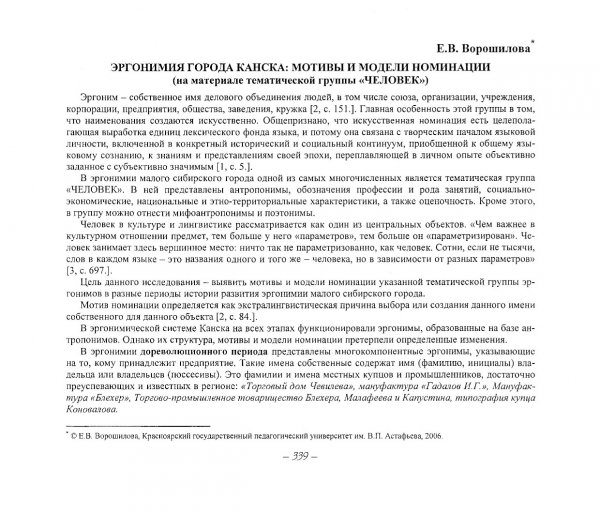 Библиографическое описание:Ворошилова, Е. В. Эргонимия города Канска: мотивы и модели номинации : (на материале тематической группы "ЧЕЛОВЕК") / Е. В. Ворошилова. - Текст : непосредственный // Вестник Красноярского государственного университета. - 2006. - Гуманитарные науки, № 6(1). - С. 339-342. - Библиогр. в конце ст.