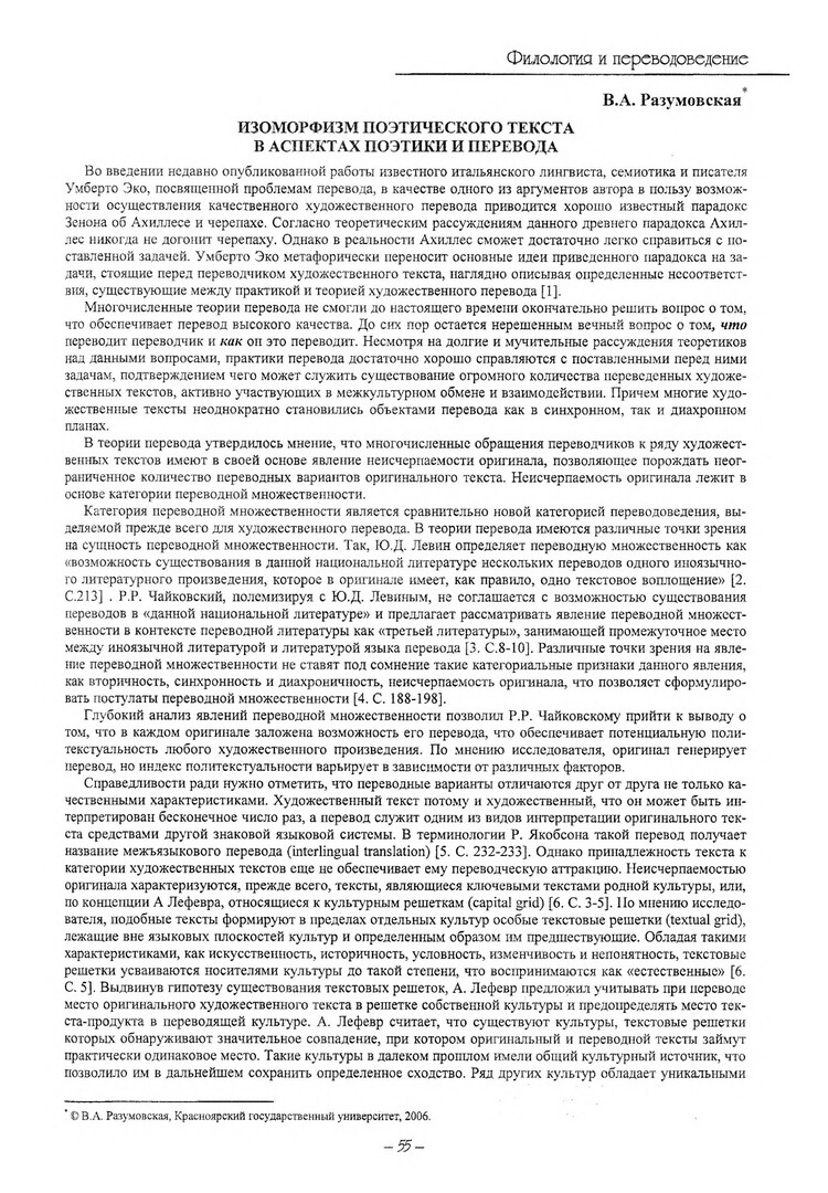 Библиографическое описание:Разумовская, Вероника Адольфовна. Изоморфизм поэтического текста в аспектах поэтики и перевода / В. А. Разумовская. - Текст : электронный // Вестник Красноярского государственного университета. - 2006. - Гуманитарные науки, № 6(2). - С. 55-59. - Библиогр. в конце ст.