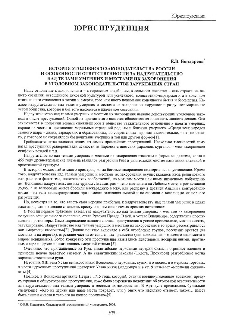 Библиографическое описание:Бондарева, Евгения Валерьевна. История уголовного законодательства России и особенности ответственности за надругательство над телами умерших и местами их захоронения в уголовном законодательстве зарубежных стран / Е. В. Бондарева. - Текст : электронный // Вестник Красноярского государственного университета. - 2006. - Гуманитарные науки, № 6(2). - С. 103-107. - Библиогр. в конце ст.