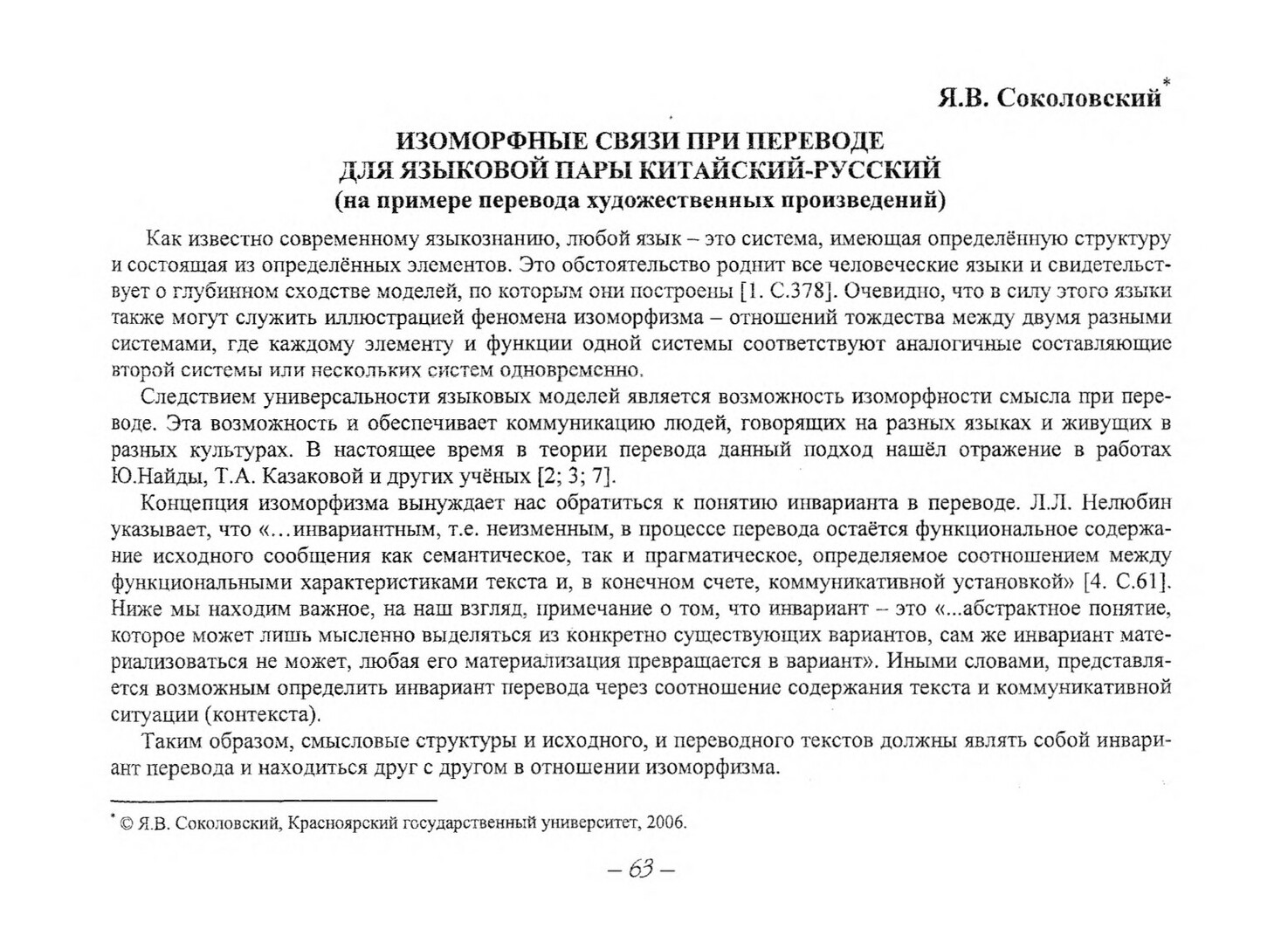 Библиографическое описание:Соколовский, Ярослав Викторович. Изоморфные связи при переводе для языковой пары китайский-русский (на примере перевода художественных произведений) / Я. В. Соколовский. - Текст : электронный // Вестник Красноярского государственного университета. - 2006. - Гуманитарные науки, № 6(2). - С. 63-66. - Библиогр. в конце ст.