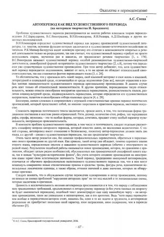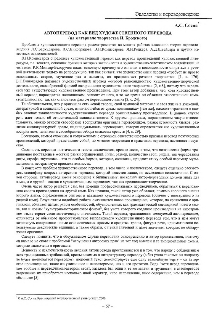 Библиографическое описание:Сосна, Анна Сергеевна. Автоперевод как вид художественного перевода (на примере творчества И. Бродского) / А. С. Сосна. - Текст : электронный // Вестник Красноярского государственного университета. - 2006. - Гуманитарные науки, № 6(2). - С. 67-70. - Библиогр. в конце ст.