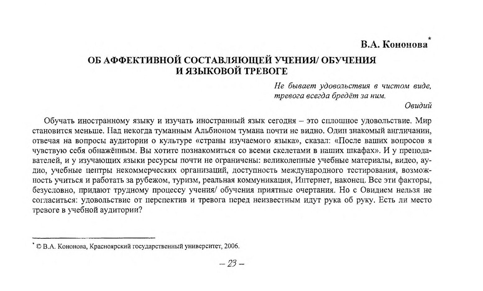 Библиографическое описание:Кононова, Валентина Анатольевна. Об аффективной составляющей учения/обучения и языковой тревоге / В. А. Кононова. - Текст : электронный // Вестник Красноярского государственного университета. - 2006. - Гуманитарные науки, № 6(2). - С. 23-31. - Библиогр. в конце ст.
