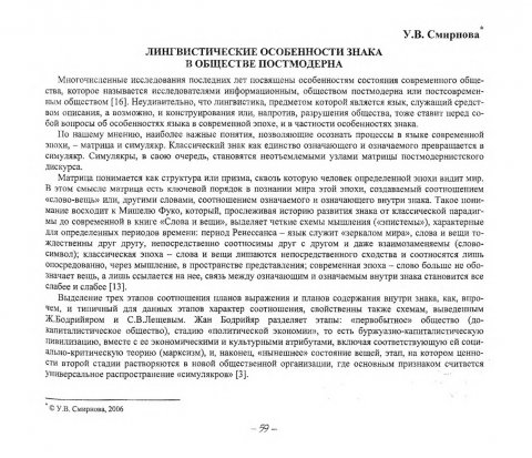 Библиографическое описание:Смирнова, Ульяна Викторовна. Лингвистические особенности знака в обществе постмодерна / У. В. Смирнова. - Текст : электронный // Вестник Красноярского государственного университета. - 2006. - Гуманитарные науки, № 6(2). - С. 59-63. - Библиогр. в конце ст.