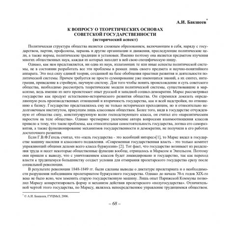 Библиографическое описание:Бакшеев, Андрей Иванович. К вопросу о теоретических основах советской государственности : (исторический аспект) / А. И. Бакшеев. - Текст : непосредственный // Вестник Красноярского государственного университета. - 2006. - Гуманитарные науки, № 6. - С. 68-73. - Библиогр. в конце ст.